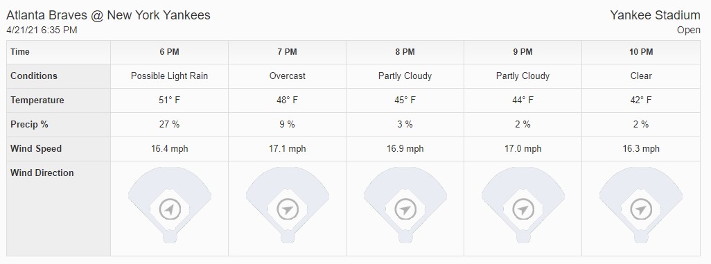 In New York, it's the opposite problem. There's a possibility that the Braves-Yankees game has a delayed start with 27% precipitation and light rain in the forecast at 6 p.m. ET (first pitch is 6:35 p.m. ET). But the weather clears up into the evening.