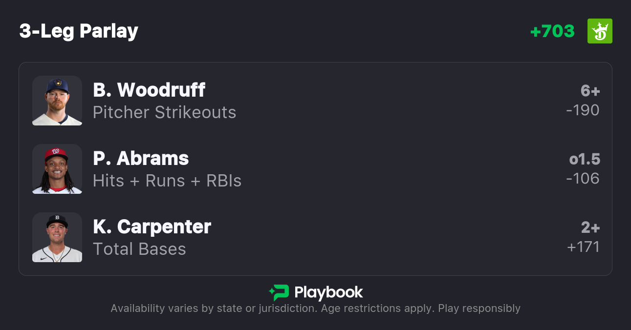 We have a 13-game slate to begin the work week. Three players I will be backing for player props tonight are Brandon Woodruff, CJ Abrams, and Kerry Carpenter.