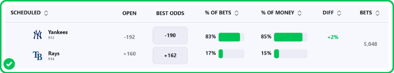 On the flip side, the Yankees come in with a verified ace in Max Fried (2-0, 1.35 ERA), making this the ideal time to strike on the favorite, as you can see in the number of bets and percentage of money coming in on this pick.