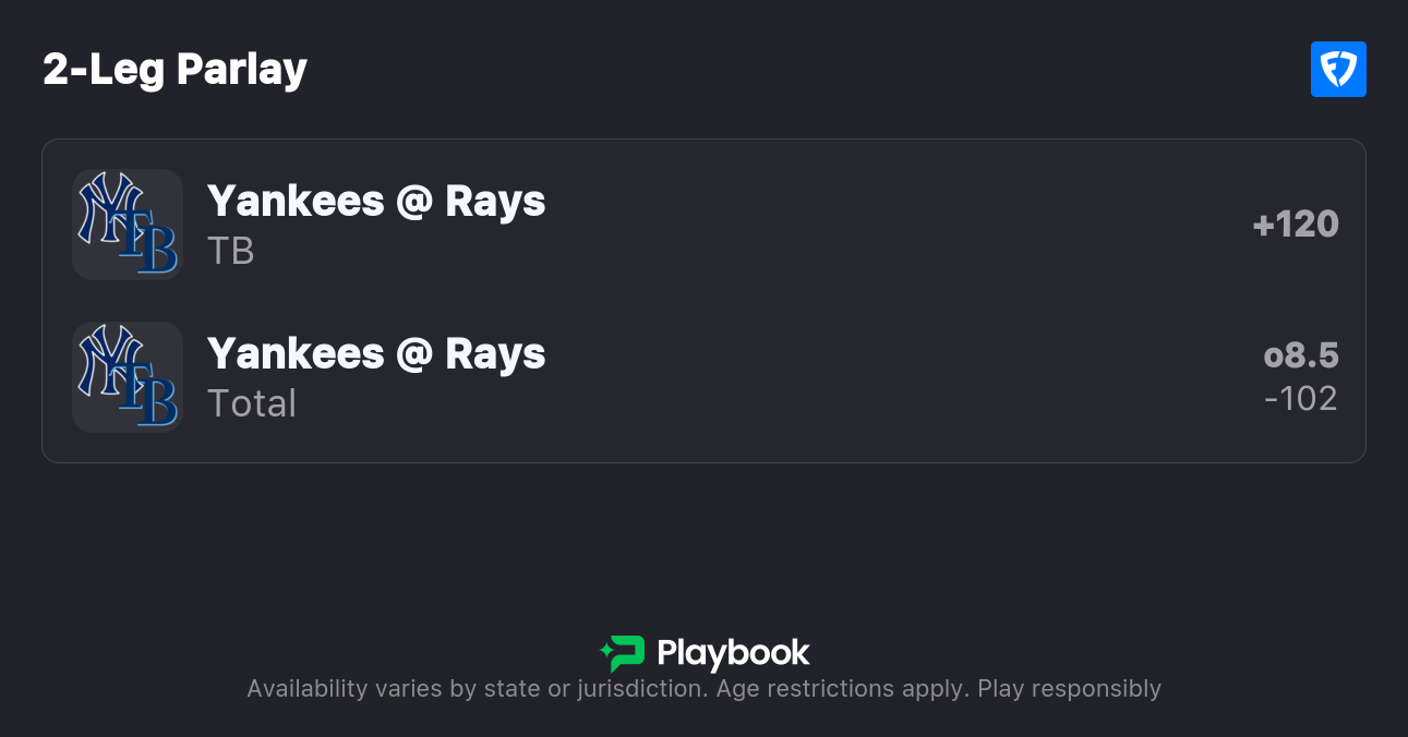 - Yankees vs Rays Picks: Rays ML (+120 or better) | Over 8.5 (-110 or Better)