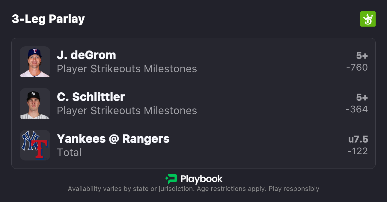 | RHP Cam Schlittler (NYY) | Stat | RHP Jacob deGrom (TEX) |