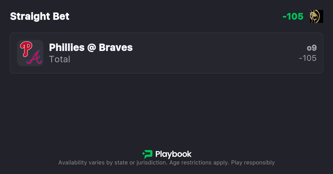 - Phillies vs Braves over/under: 9 (-105o / -115u)