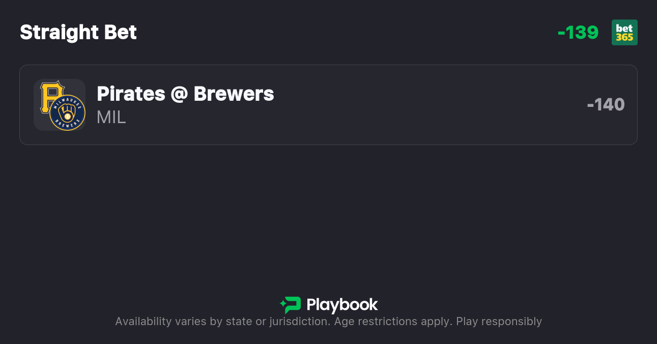 - Pirates vs Brewers moneyline: Pirates +117, Brewers -140