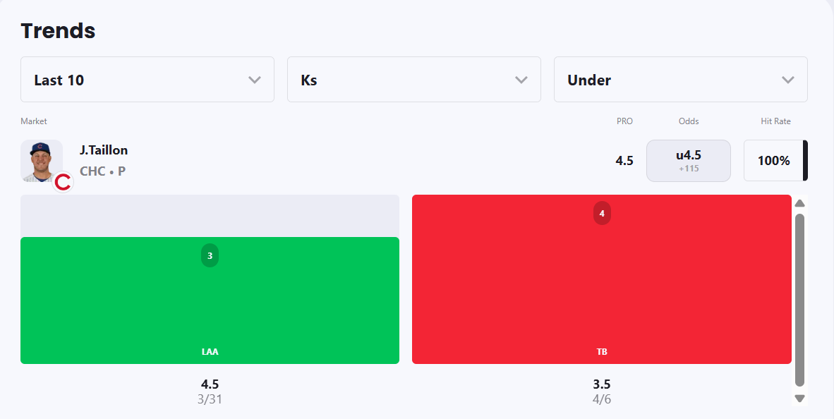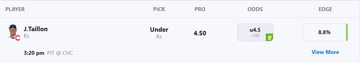 Action PRO projects Cubs starter Jameson Taillon for 4.50 strikeouts in his matchup against the Pirates this afternoon, giving us an 8.8% edge against the market compared to his current prop line of 4.5, which is enough to lean toward the Under in our system.