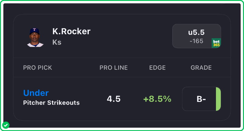 Action PRO projects Texas Rangers starter Kumar Rocker for 4.5 strikeouts in his matchup against the Pittsburgh Pirates tonight, giving us a solid 8.5% edge against the market when compared to his current prop line of over/under 5.5 strikeouts, which is good enough to tag the Under with a B- grade in our system.