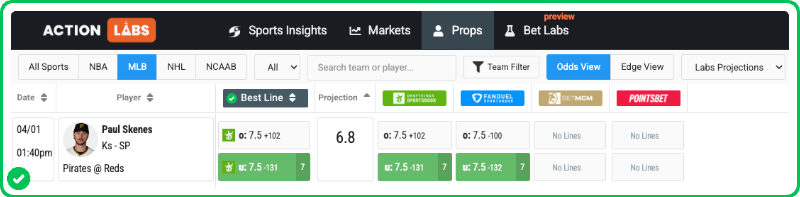 However, our PRO tools project him for 6.8 strikeouts against the Reds, providing about a 6% edge against the current price at DraftKings.