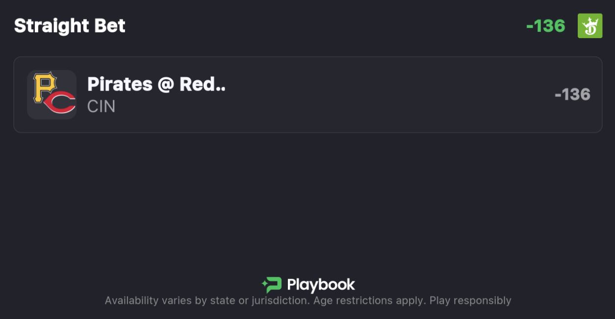- Pirates vs Reds spread: Pirates +1.5 (-186), Reds -1.5 (+153)