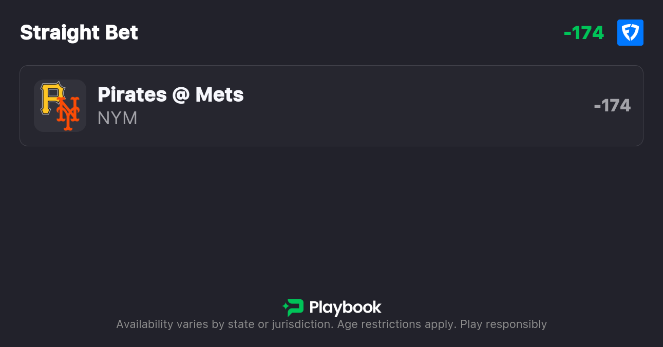 - Pirates vs Mets moneyline: Pirates +146, Mets -174