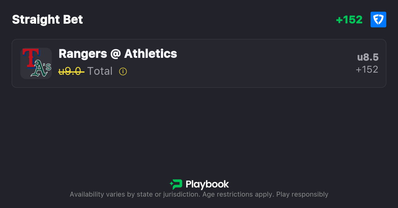 - Rangers vs Athletics over/under: 9 (-115o / -105u)