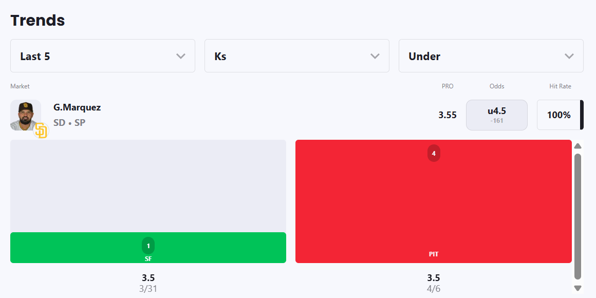 Action PRO projects Rockies starter German Marquez for 3.56 strikeouts in his matchup against the Padres tonight, giving us a solid 10.3% edge against the market compared to his current prop line of 4.5, which is good enough to tag the Under with a B grade in our system.