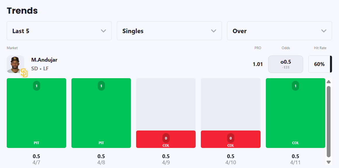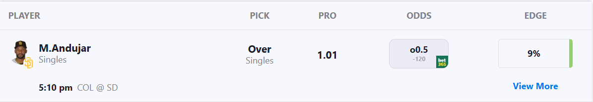 Action PRO projects Padres outfielder Miguel Andujar for 1.01 singles, giving us a solid 9% edge against the market compared to his current prop line of over/under 0.5, which is good enough to tag the Over with a B- grade in our system.