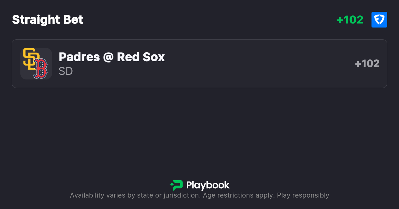 - Padres vs Red Sox moneyline: Padres +102, Red Sox -120