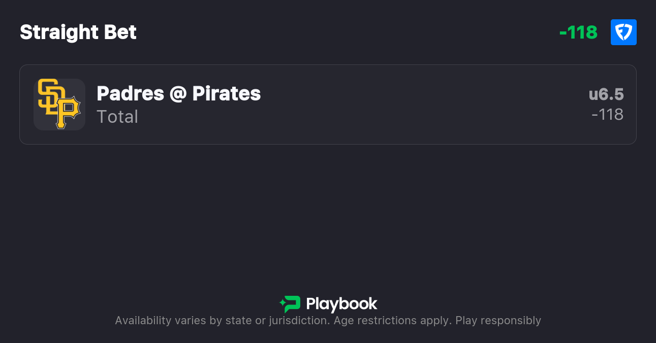 - Padres vs Pirates over/under: 6.5 (-104o / -118u)