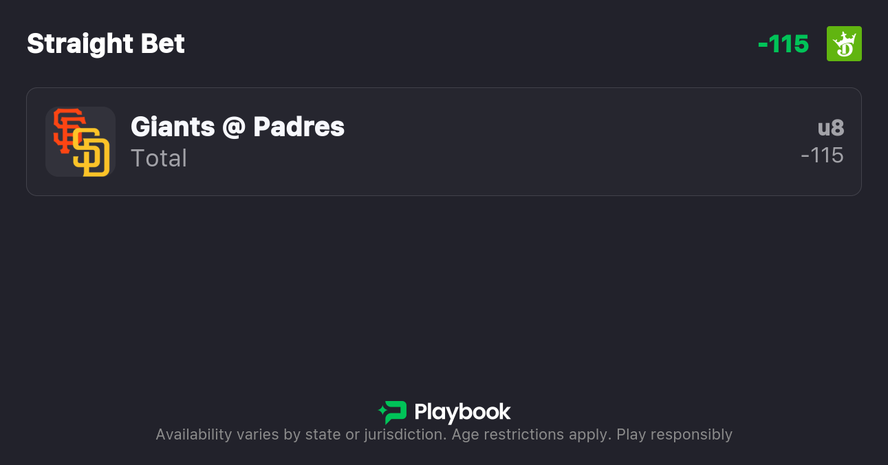 - Giants vs Padres over/under: 8 (-105o / -115u)