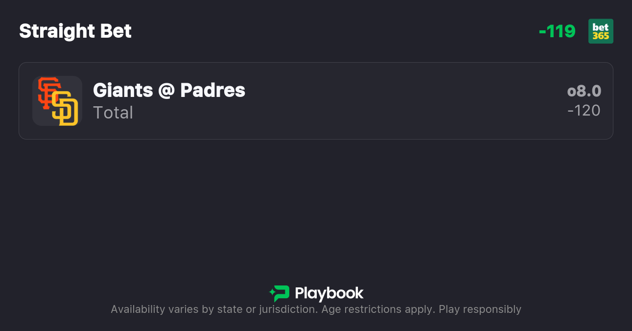 - Giants vs Padres over/under: 8 (-120o / +100u)