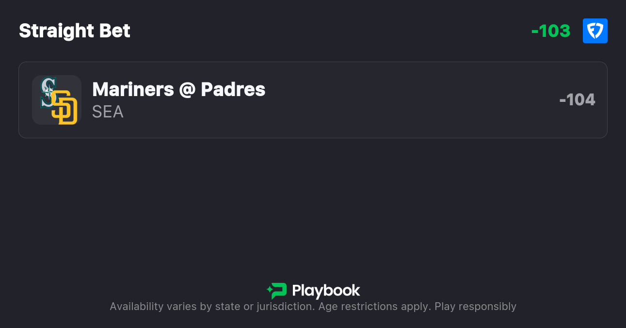 - Mariners vs Padres moneyline: Mariners -104, Padres -112