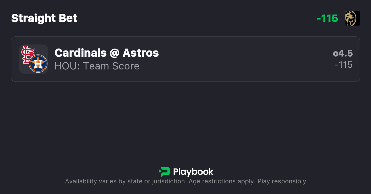 - Cardinals vs Astros Pick: Astros Over 4.5 Team Runs (-115 | Play to -140)