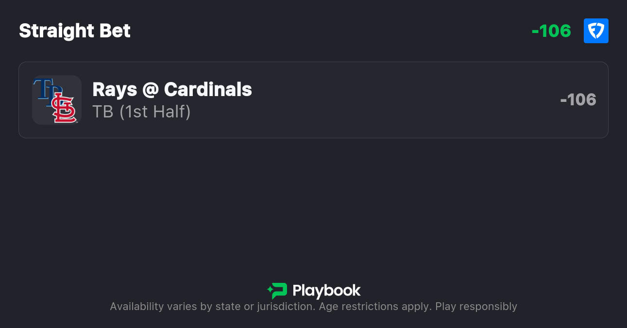 My Rays vs Cardinals best bet is Rays F5 ML. Make sure to find the best odds by checking our live MLB odds page.