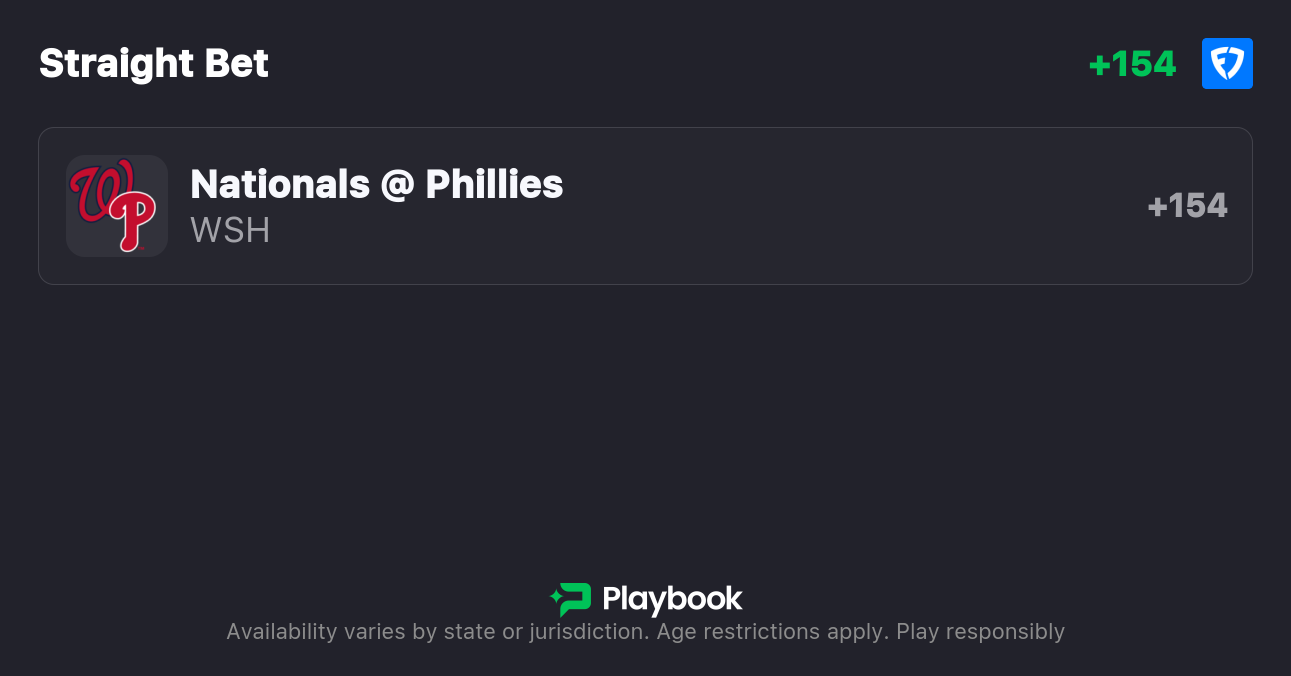 - Nationals vs Phillies moneyline: Nationals +154, Phillies -184