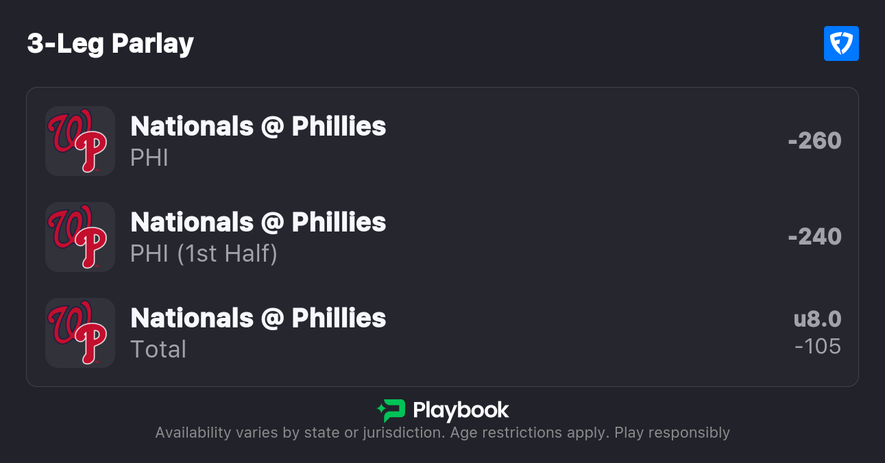 - Nationals vs Phillies Pick: Phillies ML (-275 or Better) | Phillies F5 ML (-260 or Better) | Under 8 (+100 or Better)
