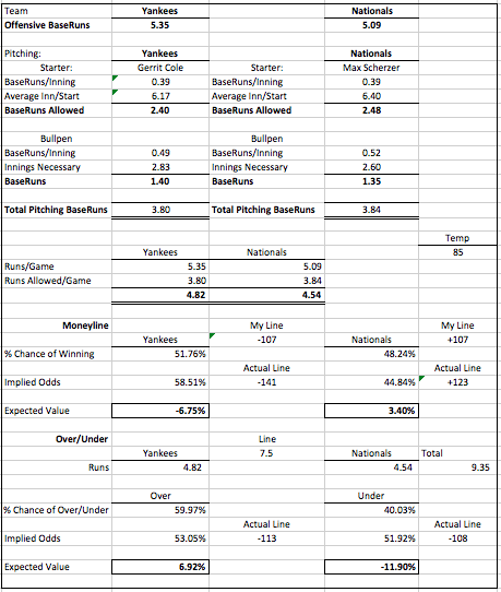 Nationals Runs Scored: ((Nationals Projected BaseRuns Scored x Opponents Projected BaseRuns allowed) / MLB average BaseRuns per game).