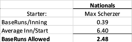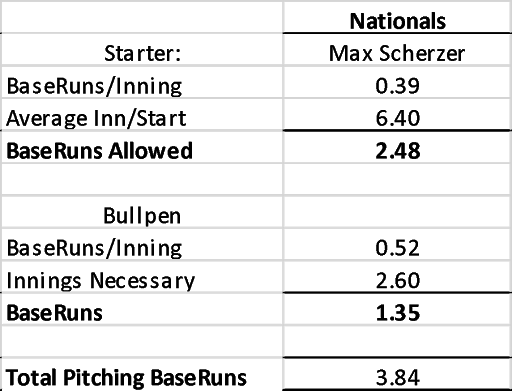 So, now that I have the average bullpen BaseRuns per Inning, I take nine innings minus the projected starting pitchers innings. In the example above, it would be nine innings minus Max Scherzer's 6.40 innings to get 2.60 innings for which the bullpen would be responsible.