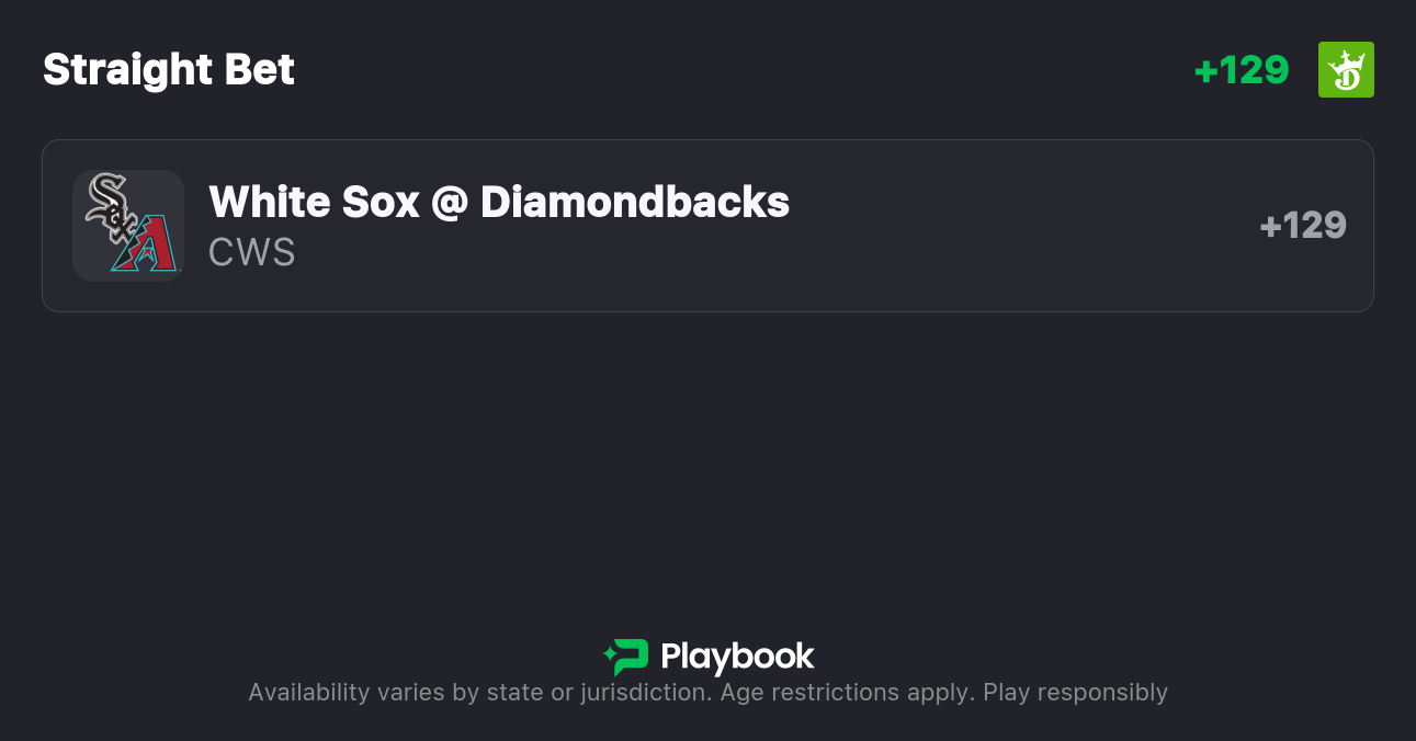 - White Sox vs Diamondbacks Pick: White Sox ML (+129, DraftKings)