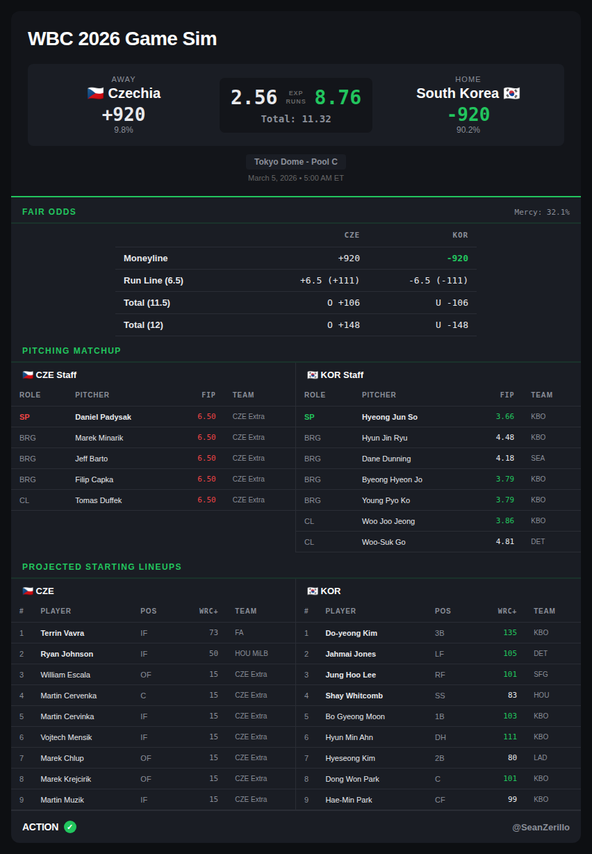 Korea has failed to advance past the pool stage since losing the 2009 final against Japan in extra innings. Still, they are sending a much younger and better club in 2026, led by the Giants' Jung Hoo Lee (107 wRC+, 2.4 WAR in 2025) and the Tigers' Jahmai Jones (career 107 wRC+ in 287 PA), alongside a pair of 22-year-old domestic starts; KT Wiz phenom Hyun-Min Ahn (1.018 OPS, 75 BB, 72 K, 22 HR in 112 games played in 2025), and Kia Tigers' third baseman Do Yeong Kim (1.067 OPS, 38 HR, 40 SB in his 2024 KBO MVP campaign). Korea projects as my sixth-best offensive team in the field. Additionally, improved pitching (projected 4.2 FIP, 4th) should be the difference maker; surrendering 26 runs in four games of Pool play cost them the tiebreaker in 2023.