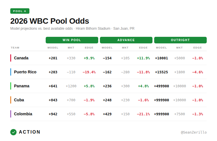 Although Canada has never advanced in five trips to the World Baseball Classic, I favor them to win a watered-down Pool A, showing significant edges on their outright Pool odds, or at least secure one of the top two spots and advance.