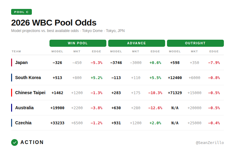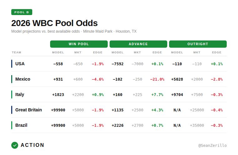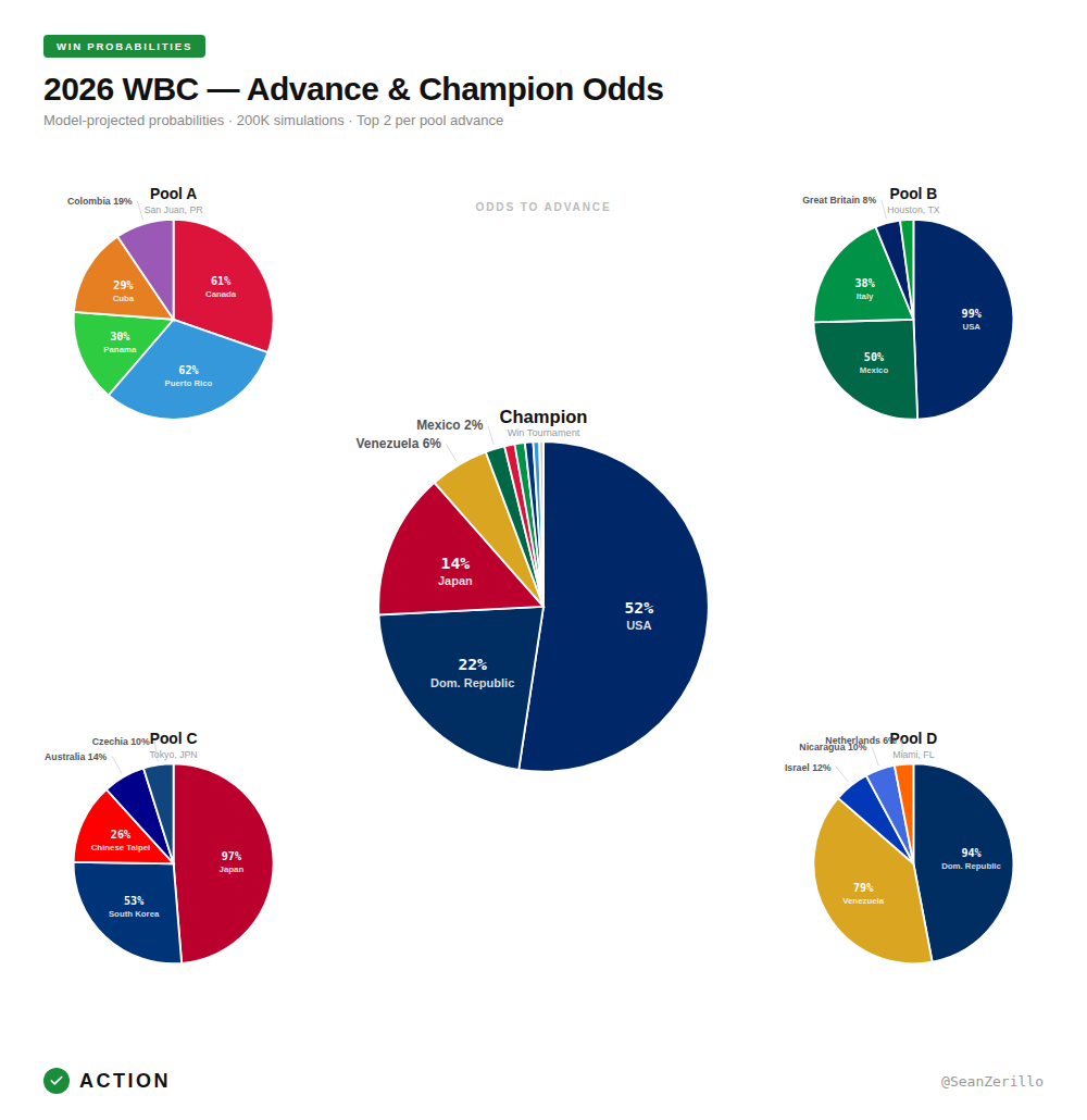 Below, I'll discuss my methodology for projecting the 2026 World Baseball Classic, provide my projections for pool winners, teams to advance, and to win the tournament, and discuss where my anticipated betting edges and allocations are relative to the market odds.