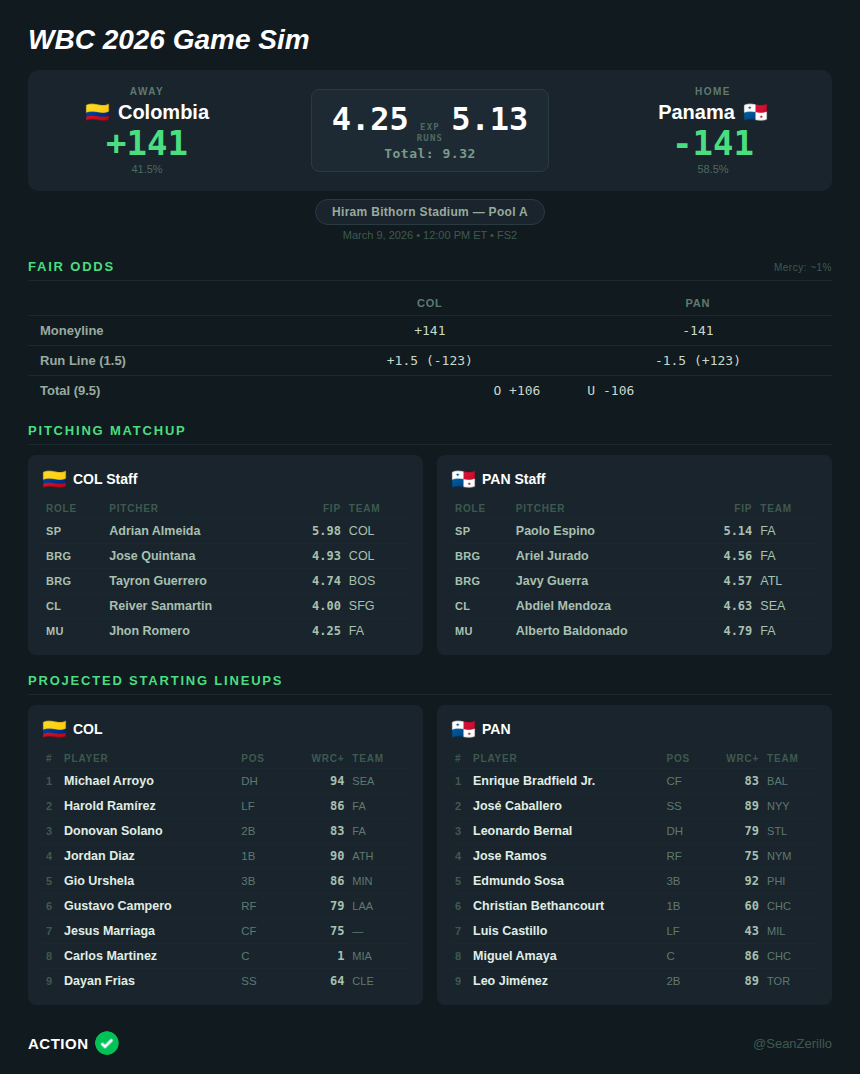 Both teams have relatively tired bullpens, but I do expect Colombia to throw their best available arms — they can automatically qualify for the next WBC with a win.
