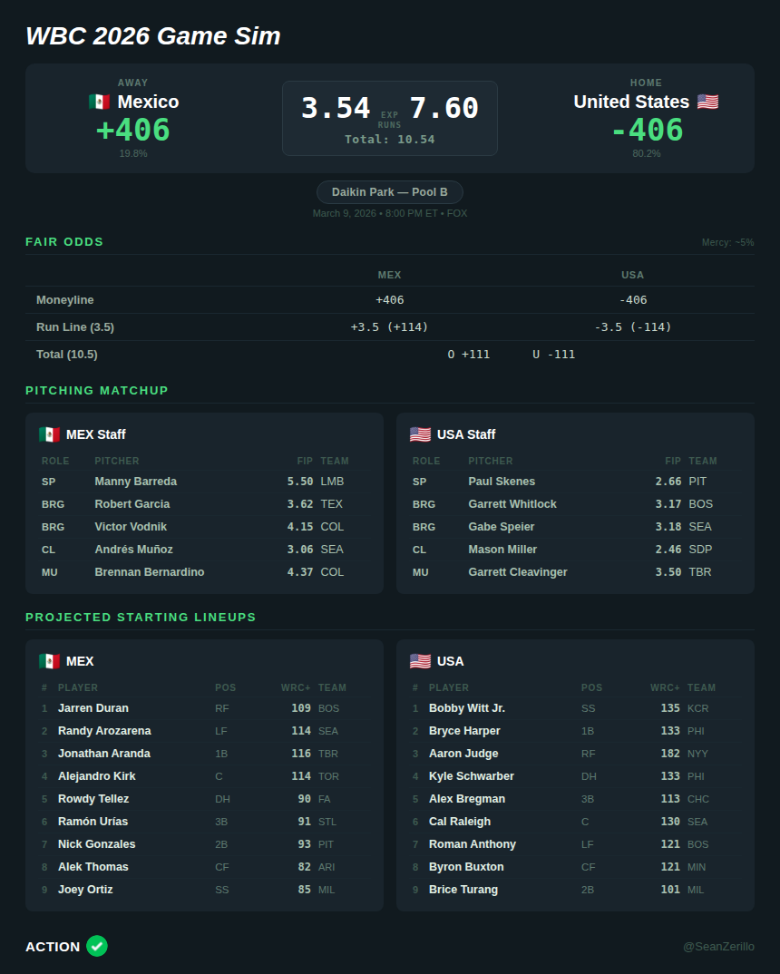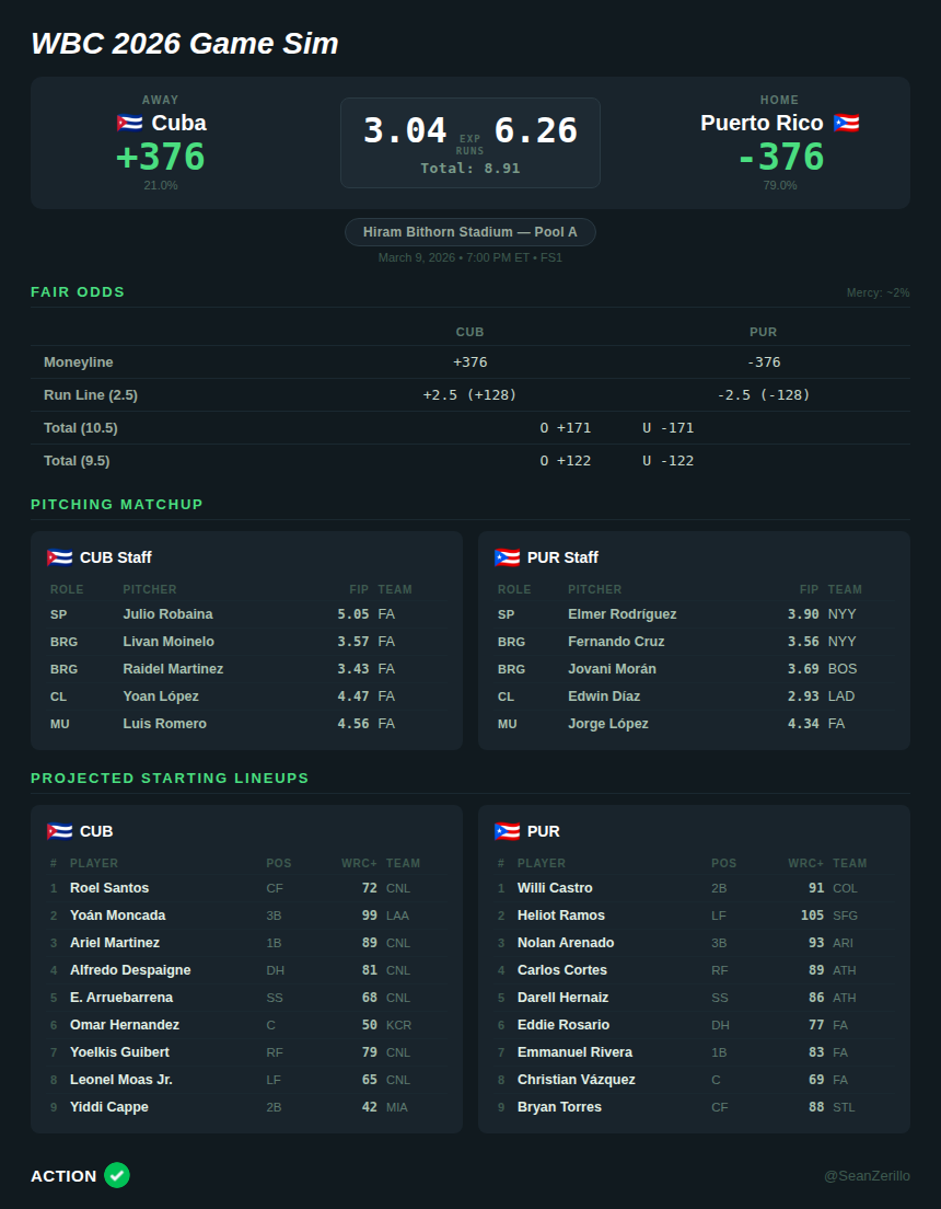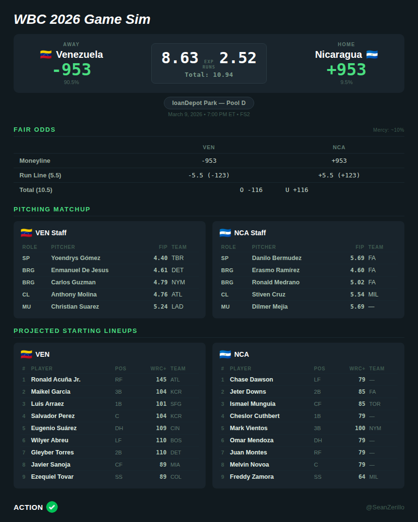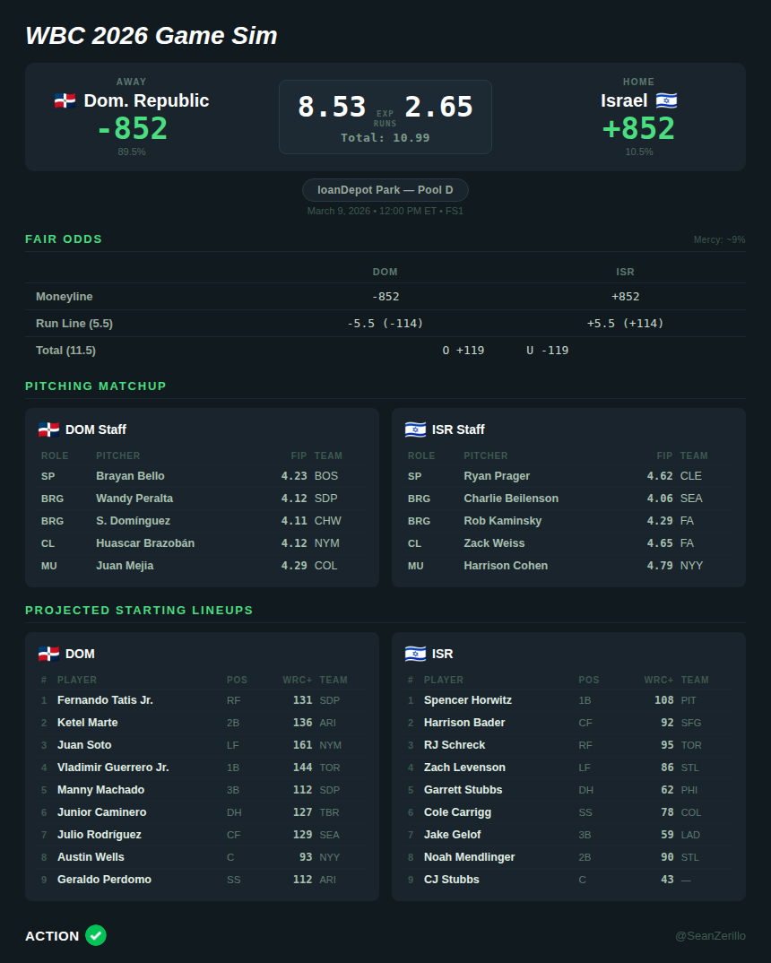 The gap between my projection and the market comes down to how much credit the model gives to the offensive talent disparity, as the DR will face Venezuela tomorrow in a likely Pool D title game, and their staff will likely hold back elite arms (Camilo Doval, Gregory Soto, Carlos Estévez) for that matchup.