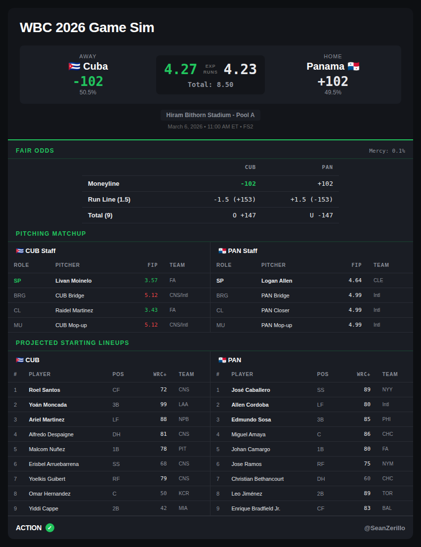 I'd make Panama the clear favorite in a neutral pitching matchup, but Monielo's presence for the first four to five innings pushed Cuba to a slight favorite in my model.