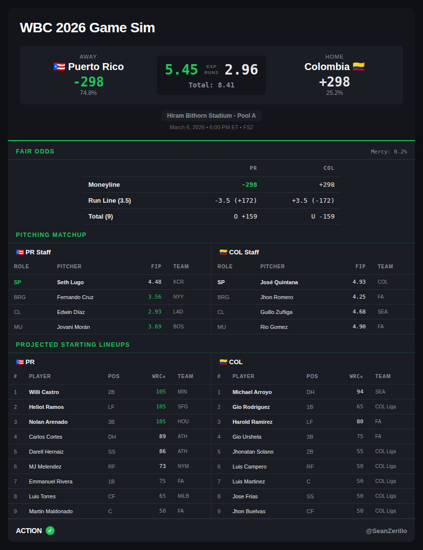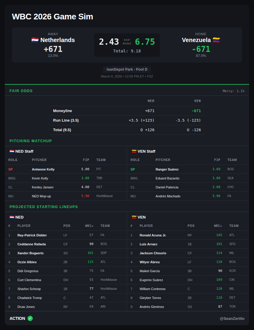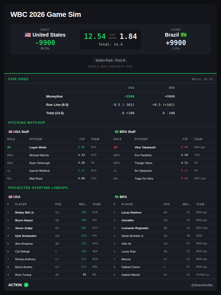 If you want my bets, make sure to follow me in the Action Network App, and if you want my projections for the 5 a.m. ET games, or any of the weekend WBC games, make sure to follow me on Twitter.