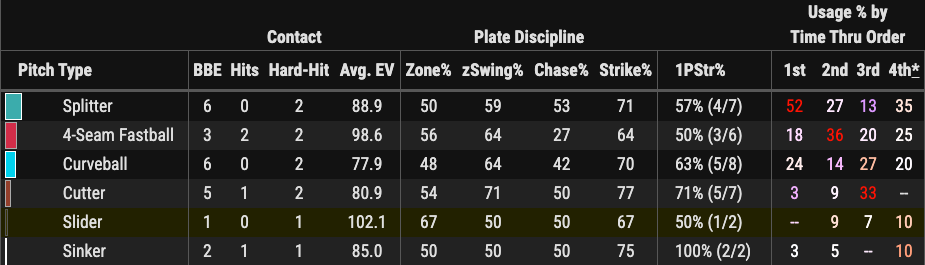 For example, he was extremely splitter-heavy the first time through the order in Game 2 against Toronto, refocused on his fastball the second time through the order, then deployed his cutter and curveball for the third time through, before reintroducing his splitter for the rare fourth appearance.