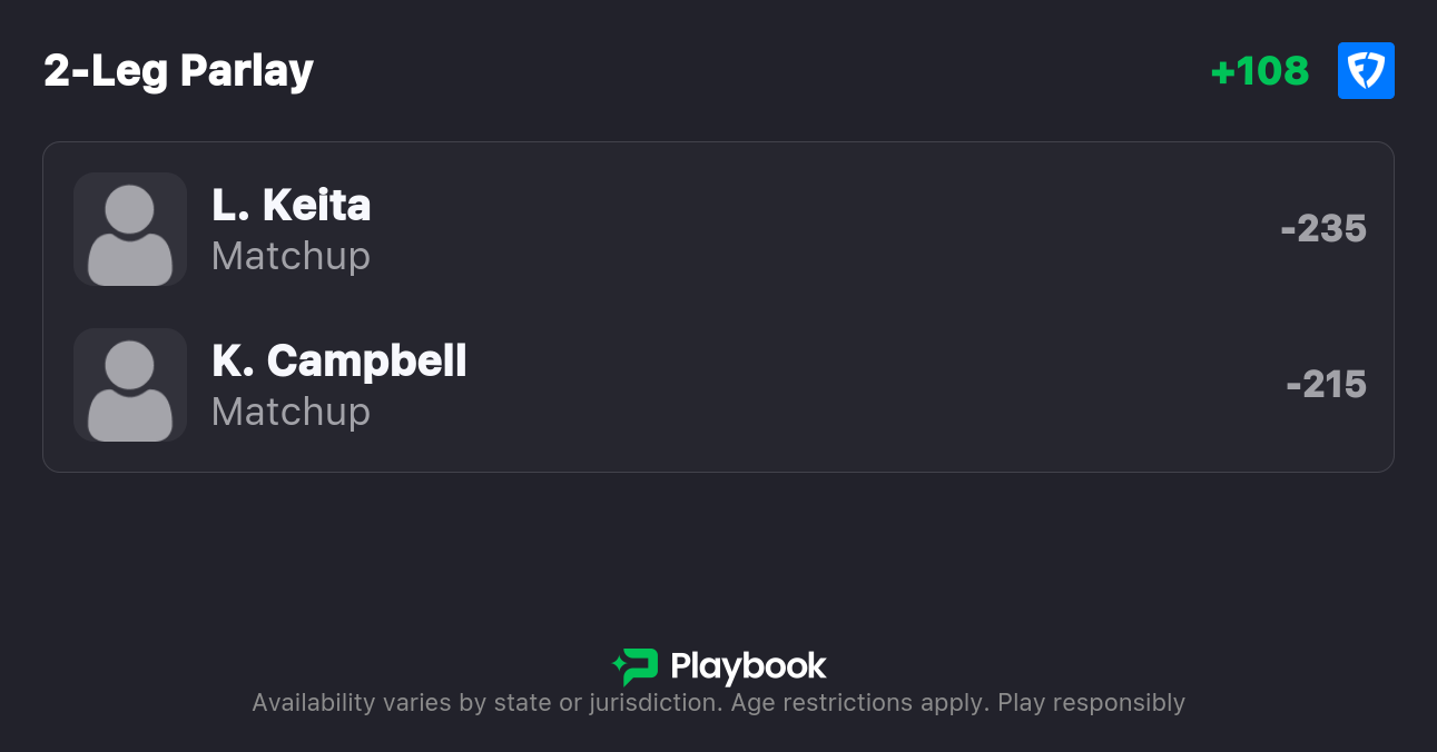 Regardless, my early bet on Campbell at -210 has paid off, with the best price on him now around -230. Since the opportunity to get his moneyline at the best price is long gone, it makes sense to pair him with another option.