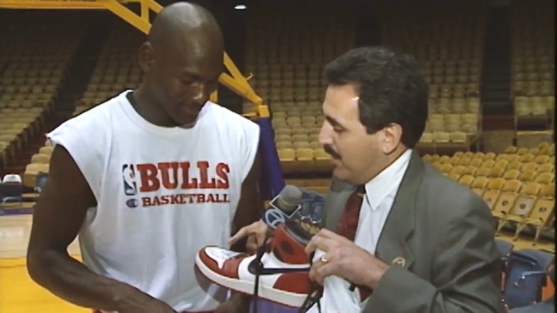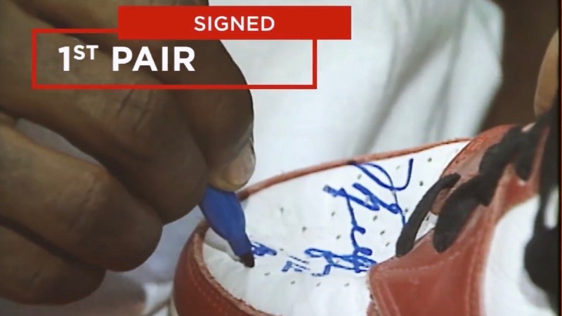 The pair of Air Jordan I's, one shoe in size 13 and one in size 13.5, as Jordan wore throughout his entire career, was given to KABC Los Angeles broadcaster Rick Lozano by Jordan's teammate Gene Banks.
