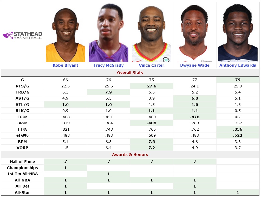 That's Bryant in 2000, McGrady in 2002, Carter in 2001, Wade in 2005, and Edwards in 2024, all around the same age and stage of their respective careers.