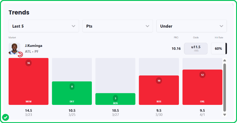 Action PRO is projecting Jonathan Kuminga for 10.16 points in the Hawks’ matchup against the Nets tonight, presenting a strong 21.7% edge against the market compared to his current prop line of over/under 12.5, which is good enough to tag the Under with an A+ grade in our system.