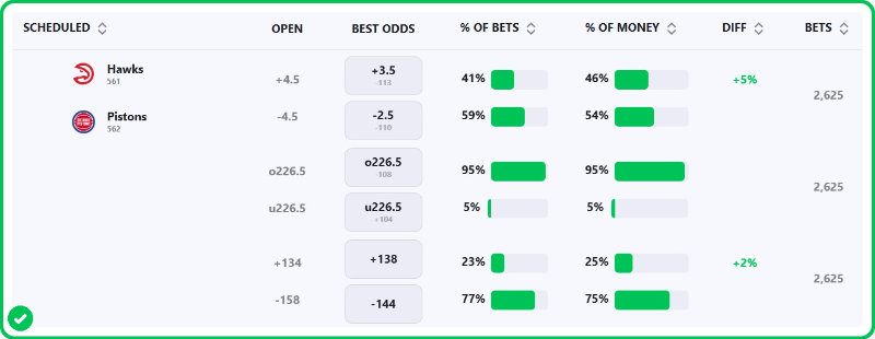 The Pistons are 2.5-point favorites over the Hawks on the spread (Pistons -2.5), with the over/under set at 227.5 total points. Detroit is a -148 favorite to win outright on the moneyline, while Atlanta is +124 to pull off the upset.