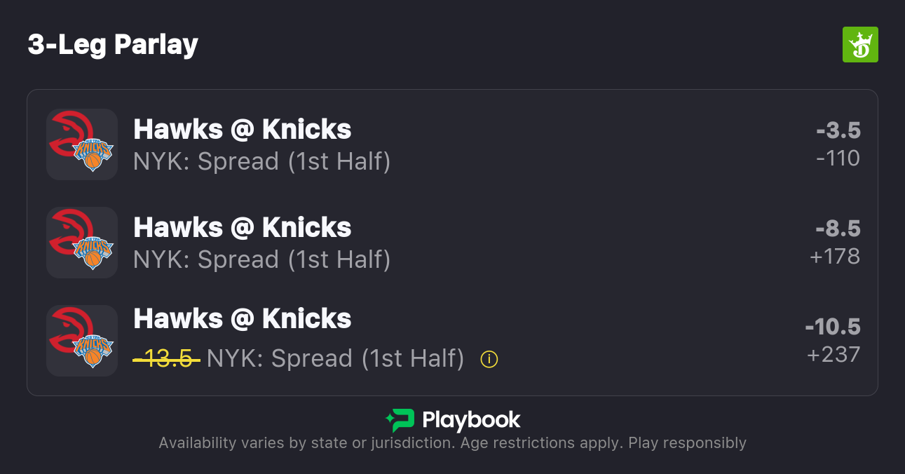I’m playing the standard -3.5, but I’m also hunting the alternates: Knicks 1H -8.5 (+245), Knicks 1H -13.5 (+575).