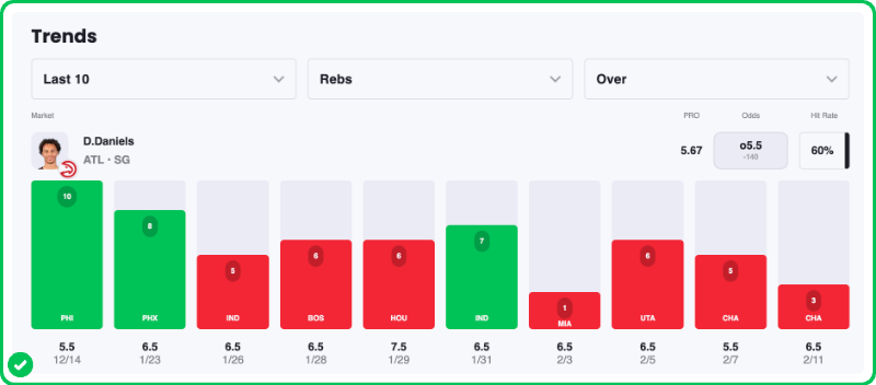 Dyson Daniels has recorded at least five rebounds in five straight games against Philadelphia, averaging 7.8 per game over that span.