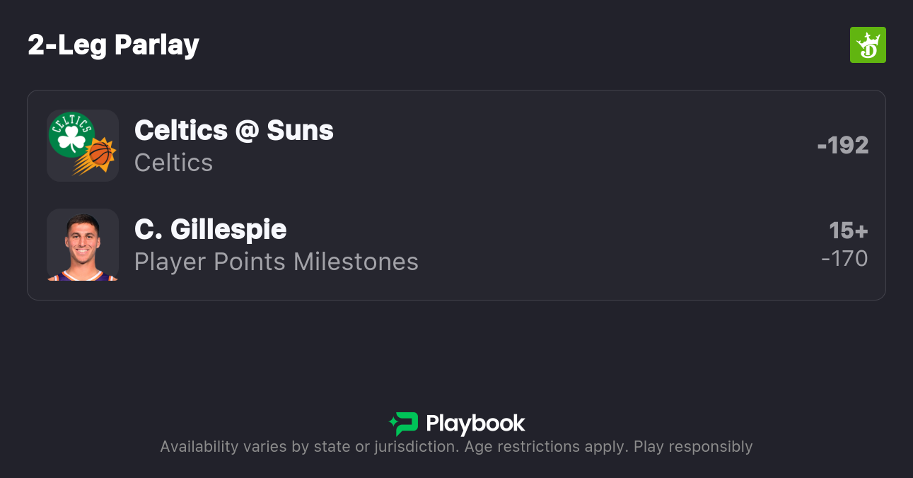 My Suns vs. Celtics best bet is a same game parlay combining Boston moneyline and Collin Gillespie to score 15+ points for a payout of +150. Make sure to find the best odds by checking our live NBA odds page.