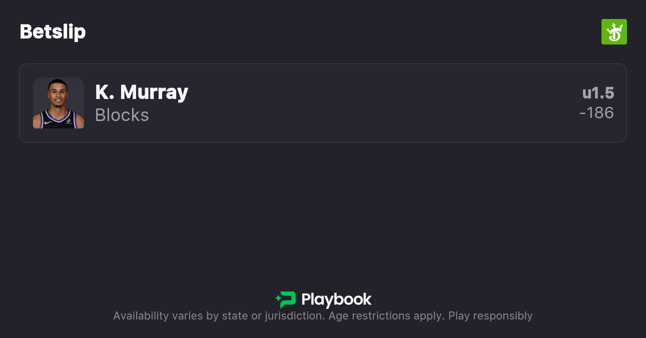 - Keegan Murray Under 1.5 Blocks (-186, DraftKings)