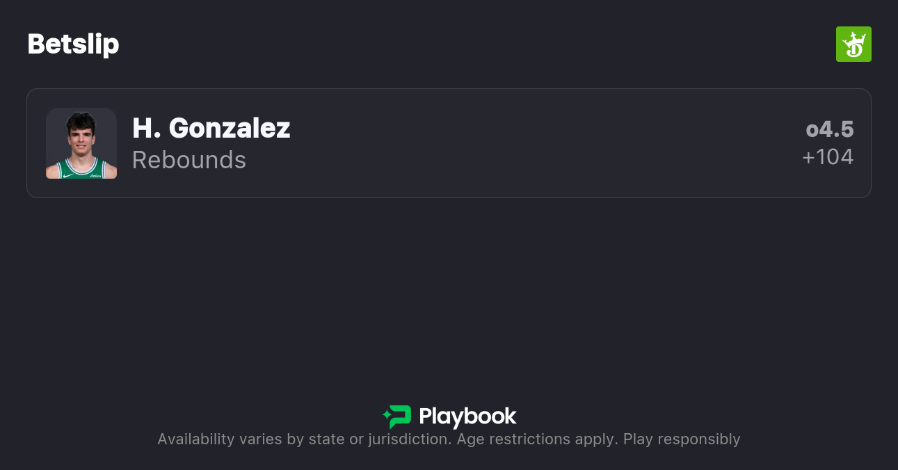 - Celtics vs Jazz pick: Hugo Gonzalez Over 4.5 Rebounds (+104)