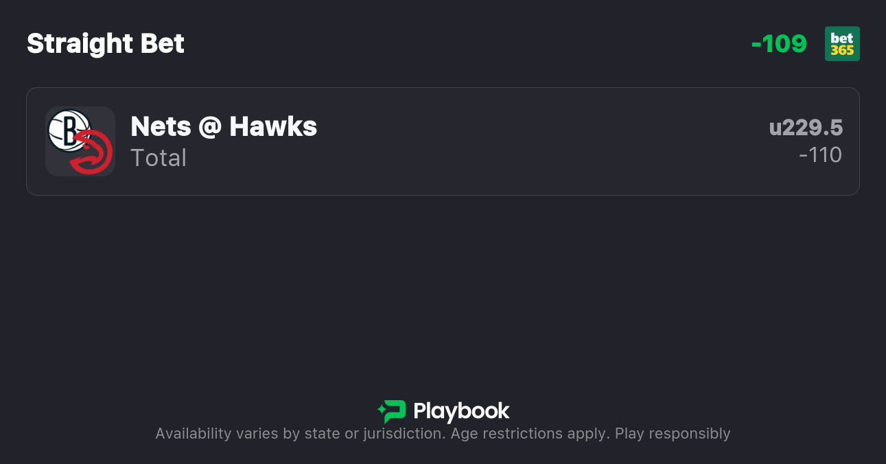 - Nets vs Hawks pick: Under 229.5 (-110)