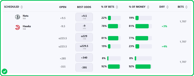 The Hawks are 9.5-point favorites over the Nets on the spread (Hawks -9.5), with the over/under set at 229.5 total points. Atlanta is a -390 favorite to win outright on the moneyline, while Brooklyn is +310 to pull off the upset.
