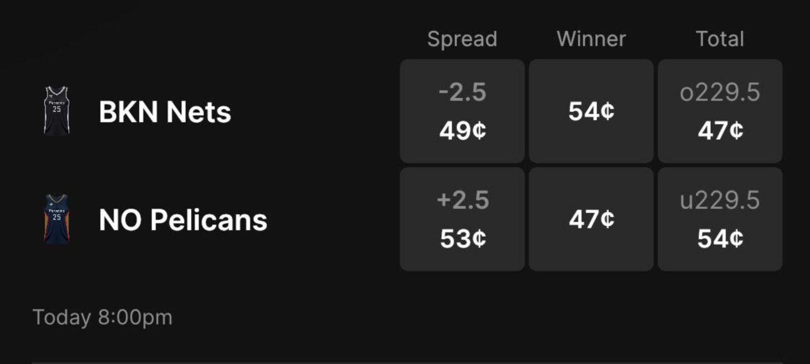 The Nets are 2.5-point favorites over the Pelicans on the spread (Nets -2.5), with the over/under set at 229.5 total points. Brooklyn is a 54-cent favorite to win outright, while New Orleans is priced at 47 cents to pull off the upset on Fanatics Markets.