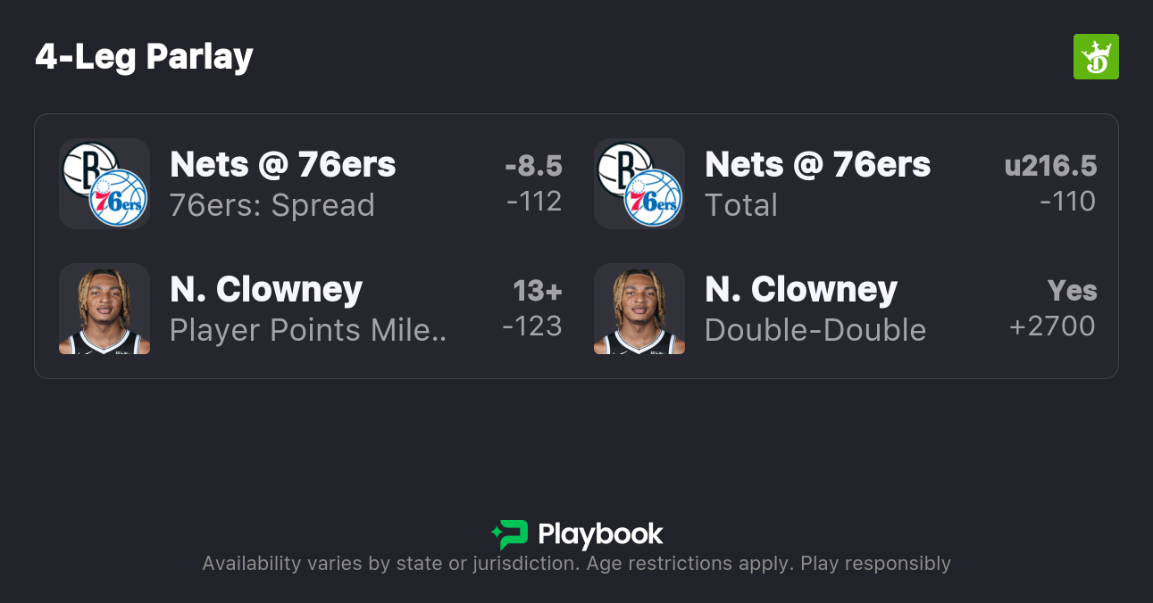 The 76ers are 8.5-point favorites over the Nets on the spread (76ers -8.5), with the over/under set at 216.5 total points. Philadelphia is a -380 favorite to win outright on the moneyline, while Brooklyn is +300 to pull off the upset.