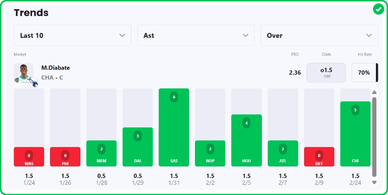 Pick: Moussa Diabate Over 1.5 Assists (-160, bet365)